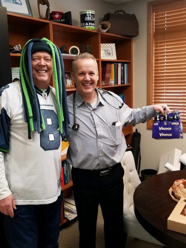 Sometimes a patient and doctor get a little competitive. Someone has to lose. A Monday night NFL nailbiter between the Seahawks and Vikings gave Dr. Erikson bragging rights. Don Rankin pays his dues. He had to wear Dr. Erikson’s Seahawk’s garb and buy him of a 6 pack of coke. Don got the last laugh though by tormenting Dr. Erikson with a little Viking representation! See Duck Tape IS good for everything!